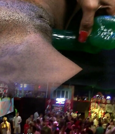 Huge boobed ebony girl plays with her shaved cameltoe pussy on the floor
