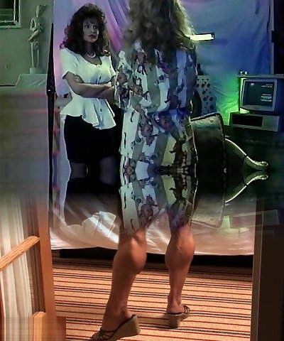 Vintage Wanilianna is dressed in elegant dress and beneath is a black retro bra, black garterbelt