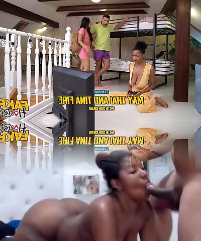 Faux Hostel - Video game playing Asian Thai girl and Ebony Latina college teens in naughty threesome with big sweaty tits